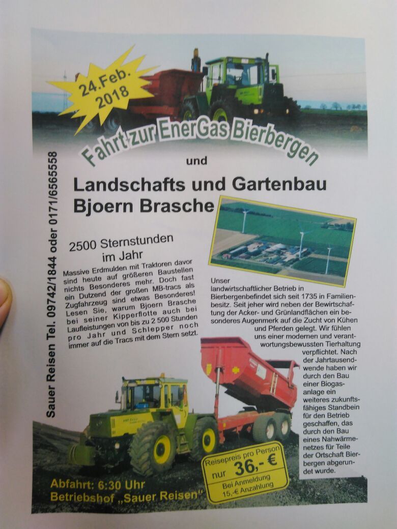 wir planen am 24.02.2018 eine Fahrt mit dem Bus (vorerst ist geplant mit einem 25 Sitzer zu fahren) nach Vechelde bei Hannover zur Firma Brasche GALA-Bau Betrieb (sollte ja jedem hier ein Begriff sein) und EnerGas in Bierbergen, ein Milchviehbetrieb mit 200 Kühen mit Biogasanlage.