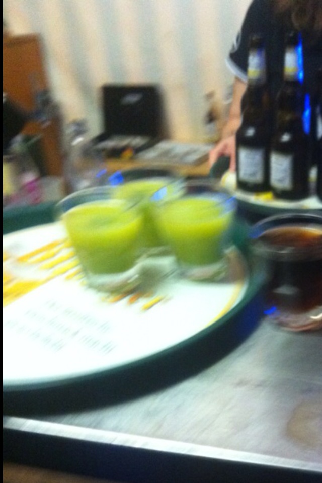 Ja unser teuflisch leckerer Intercooler hat es schon so in sich. Der kann einen schon zum schwanken bringen. Das Grundgetränk gelb grün besteht aus drei Säften und genügend Wodka. Der dazugehörige olivgrüne Eiswürfel besteht aus noch mehr Komponenten. Genaue Details gibt es natürlich nicht. Einfach zwei Jahre gedulden, dann mixen wir wieder...