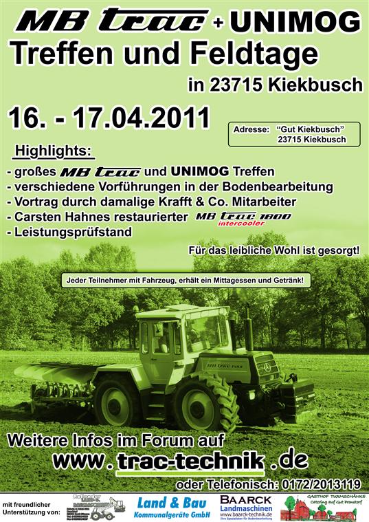 Moin Tracgemeinde!Malte (Gecko) und ich würden uns natürlich über eine grosse Beteiligung am Treffen hier in Kiekbusch freuen, auch wenn einige von Euch dafür das 1. Mal die Elbe überqueren müssen! Als Programm haben wir uns vorgenommen, einen abgestoppelten Winterweizenschlag umzubrechen und saatfertig für die Maisaussaat zu machen. Maschinen hierfür werden wir versuchen, vor Ort von den ansässigen Landtechnikhändlern zu bekommen. Wir werden auch eine Zapfwellenbremse zur Leistungsmessung vor Ort haben. Für das leibliche Wohl wird es auch was geben! Jeder, der mit einem Unimog oder MB-Trac anreist, erhält kostenlos 1 Getränk und 1 Essensgutschein! Übernachtungsmöglichkeiten in der Nähe werde ich baldmöglichst hier einstellen!