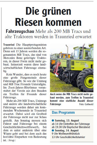 hier schon mal die Vorankündigung zum diesjährigen MB-trac,-Unimog und Oldtimer Treffen in Traunried am 13. und 14.8.2016.